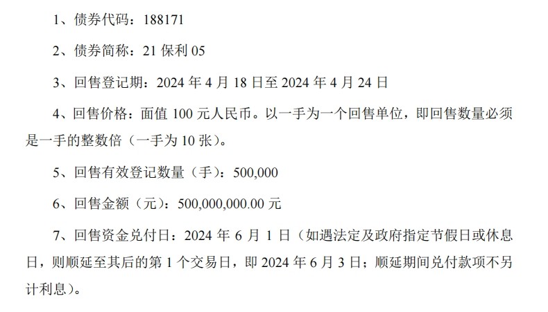 根据《保利发展控股集团股份有限公司公开发行 2021 年公司债券(第三期)募集说明书》中设定的回售条款,“21 保利 05”债券持有人可于回售登记期(2024 年 4 月 18 日至 2024 年 4 月 24 日)内对其所持有的全部或部分“21 保利 05”登记回售,回售价格为债券面值(100 元/张)。根据中国证券登记结算有限责任公司上海分公司对本期债券回售情况的统计,“21 保利 05”(债券代码:188171)回售有效期登记数量为 500,000 手,回售金额为 500,000,000.00 元。