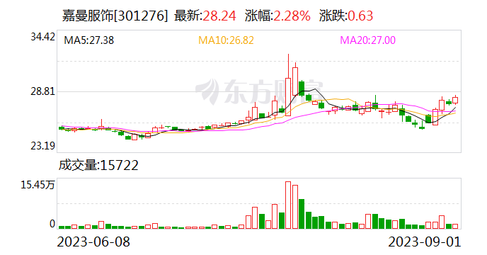 嘉曼服饰2023年上半年实现营业收入5.23亿元,同比增长5.24%,净利润9631万元,同比增长29.59%。其中,第二季度主营业务收入2.3亿元,同比上升13.31%;单季度归母净利润3187.85万元,同比上升42.31%。