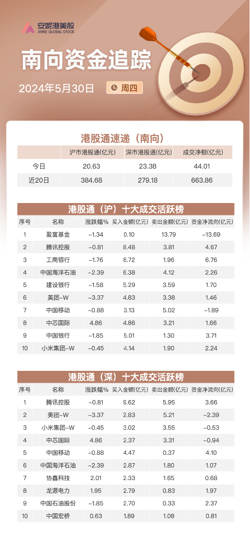南向资金5月30日净流入44亿:大幅加仓腾讯和工商银行 连续流出美团