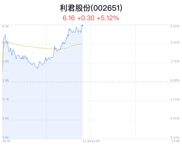 05月31日,利君股份(002651)股价大幅上涨,截至11点18分,利君股份上涨5.12%,报6.16元/股,成交7970万元,换手率2.33%,振幅4.27%。