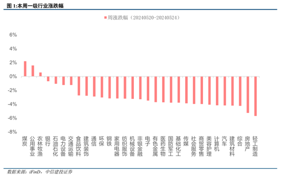 本次地产政策有利于提振商品房市场信心,对房地产市场稳定有积极作用。自地产政策宽松预期以来,市场房地产板块及部分地产链相关行业出现了明显的上涨,04/24最低点至05/17最高点,申万房地产开发板块和房地产服务板块分别上涨27.95%和43.71%,这一阶段的上涨主要为预期地产政策调整下的市场情绪修复。而本周出现了较明显的回落。