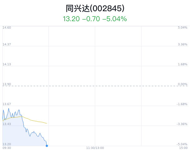 05月24日,同兴达(002845)股价大幅下跌,截至10点27分,同兴达下跌5.04%,报13.20元/股,成交1.46亿元,换手率4.82%,振幅3.45%。