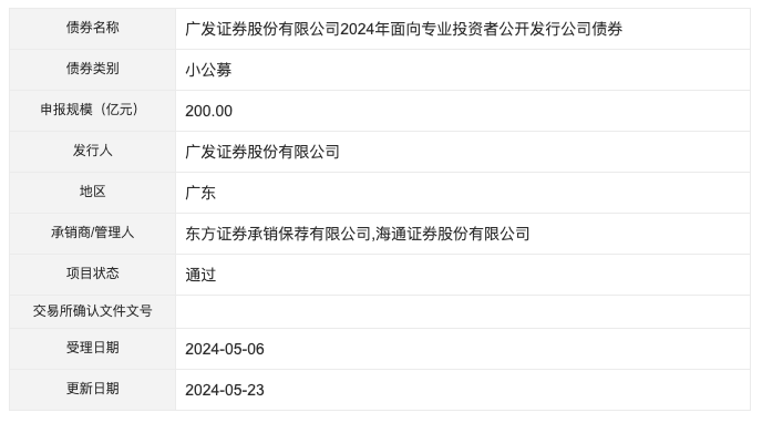 深交所项目进度信息显示,广发证券股份有限公司200亿元小公募债项目状态更新为“通过”,更新日期为2024年5月23日。募集说明书申报稿显示,本次债券的募集资金扣除发行费用后,拟用于偿还到期债务和补充流动资金。