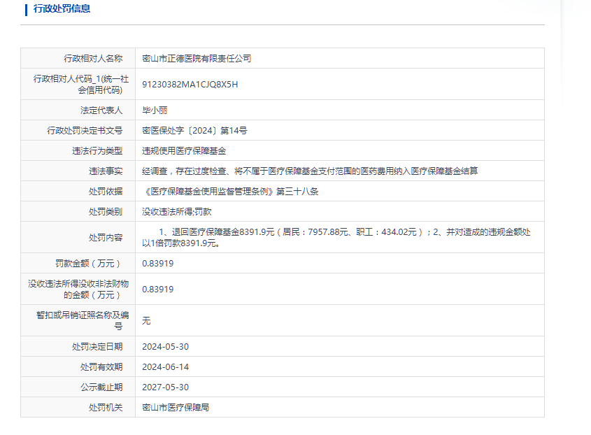 据公告内容,经调查,密山市正德医院有限责任公司存在过度检查、将不属于医疗保障基金支付范围的医药费用纳入医疗保障基金结算的行为。对此,密山市医疗保障局决定,密山市正德医院有限责任公司需退回医疗保障基金8391.9元,并对造成的违规金额处以1倍罚款8391.9元。