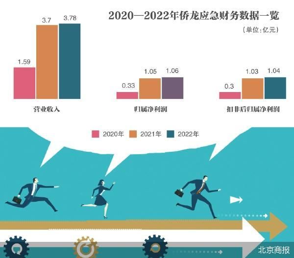 财务数据显示,2020—2022年,侨龙应急实现营业收入分别约为1.59亿元、3.7亿元、3.78亿元;对应实现归属净利润分别约为3298.07万元、1.05亿元、1.06亿元;对应实现扣非后归属净利润分别约为3039.15万元、1.03亿元、1.04亿元。