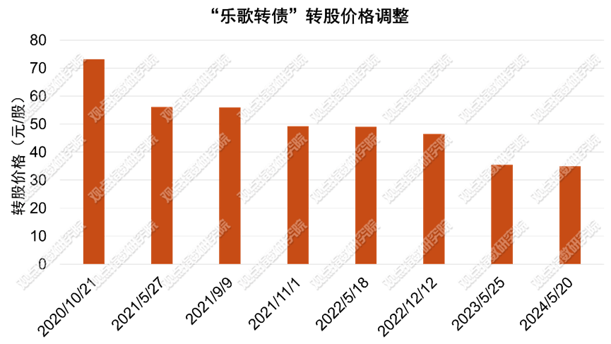 从2020年到2024年,因实行利润分配方案、股票期权激励计划激励对象自主行权、以简易程序向特定对象发行股票上市等,“乐歌转债”的转股价格共下调了8次,由发行时的73.13元/股逐步调整为34.95元/股。