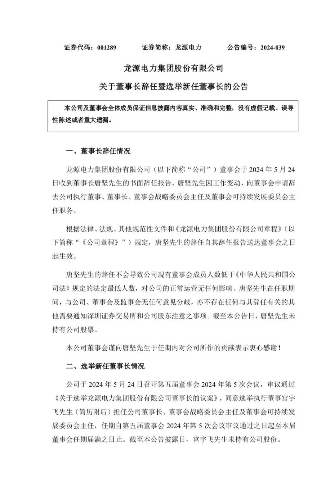 5月24日,龙源电力发布《关于董事长辞任暨选举新任董事长的公告》。公告称,公司董事会于5月24日收到董事长唐坚先生的书面辞任报告,唐坚先生因工作变动,向董事会申请辞去公司执行董事、董事长、董事会战略委员会主任及董事会可持续发展委员会主任职务。