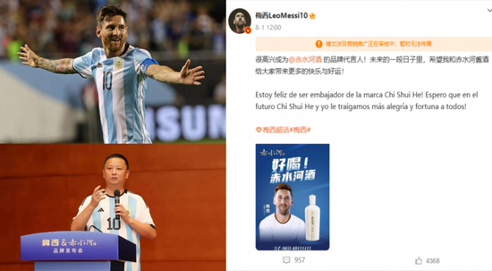 二者的交集,是梅西在8月1日发布的一条微博,宣布其成为赤水河酒的品牌代言人。