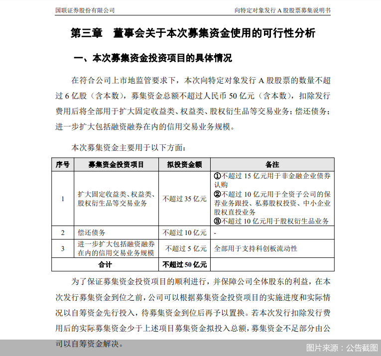 《说明书》内容显示,国联证券此次拟向不超过35名符合条件的特定对象定向发行股票募集资金,拟发行不超过6亿股(含),拟募集资金总额(含发行费用)不超过50亿元(含),扣除发行费用后将全部用于扩大固定收益类、权益类、股权衍生品等交易业务;偿还债务;进一步扩大包括融资融券在内的信用交易业务规模。