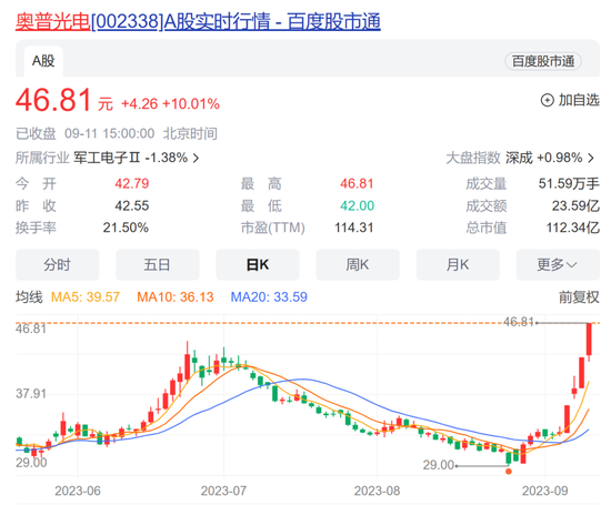 9月11日,奥普光电(002338)再度呈现出涨停走势,这是该股在最近4个交易日当中收出的第3个涨停板。截至9月11日收盘,奥普光电报于46.81元,上涨4.26元,涨幅为10.01%。