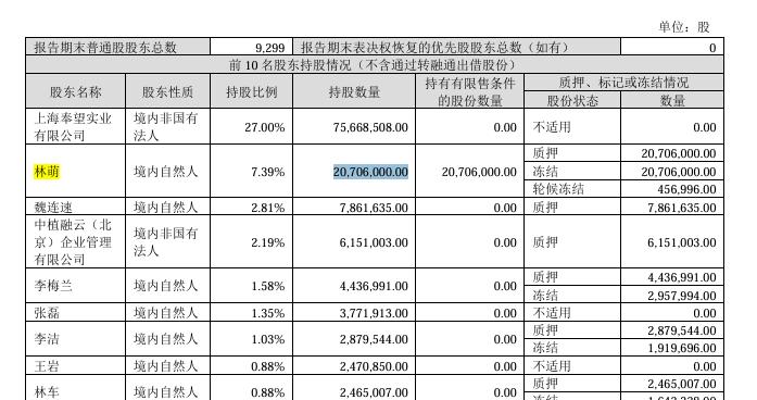 此外值得一提的是,ST宇顺在2023年年报中披露,林萌所持的2070.6万股股票均处于质押状态,其中45.7万股处于冻结状态。