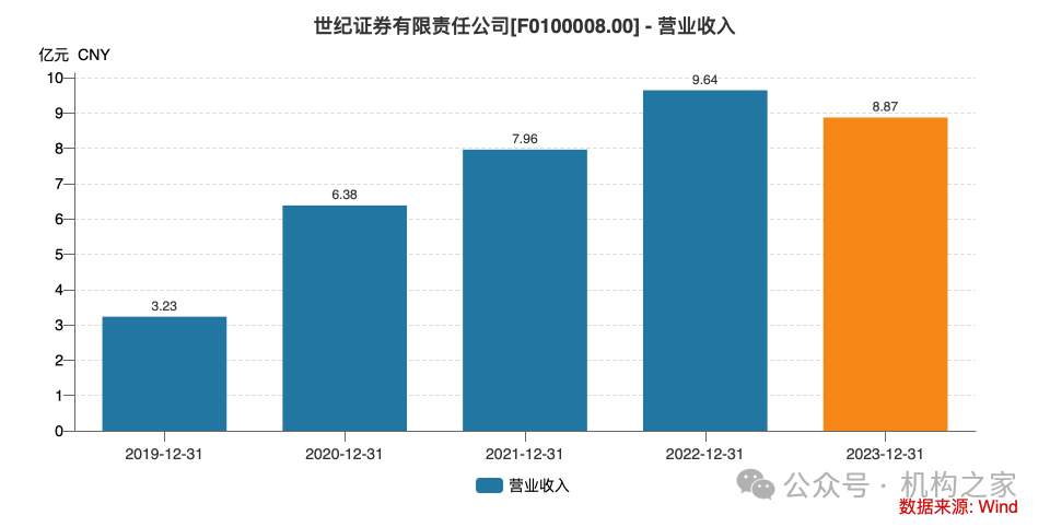 近年来,世纪证券业绩表现稳健。营业收入从2019年的3.23亿元增长至2022年的9.64亿元,虽2023年略有回落至8.87亿元,但近五年复合增速仍达22.39%,在当前市场环境下实属不易。