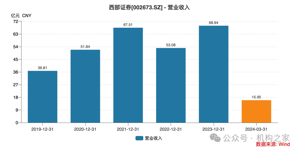 然而,仔细审视西部证券的财务数据,我们不难发现其业绩增长的隐忧。2023年,西部证券实现营业收入68.94亿元,同比增长29.87%;归母净利润11.98亿元,同比增长170%。这些数字表面上看似亮眼,但深入分析后却能发现其发展的失衡以及增长的焦虑。