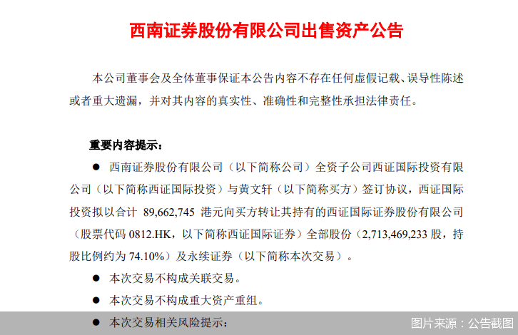 西南证券拟出售旗下孙公司。6月22日,西南证券公告称,旗下全资子公司西证国际投资有限公司(以下简称“西证国际投资”)于6月21日与黄文轩签订协议,西证国际投资拟向黄文轩转让其持有的西证国际证券全部股份(合计27.13亿股,持股比例约为74.1%)及5.8亿港元永续证券。