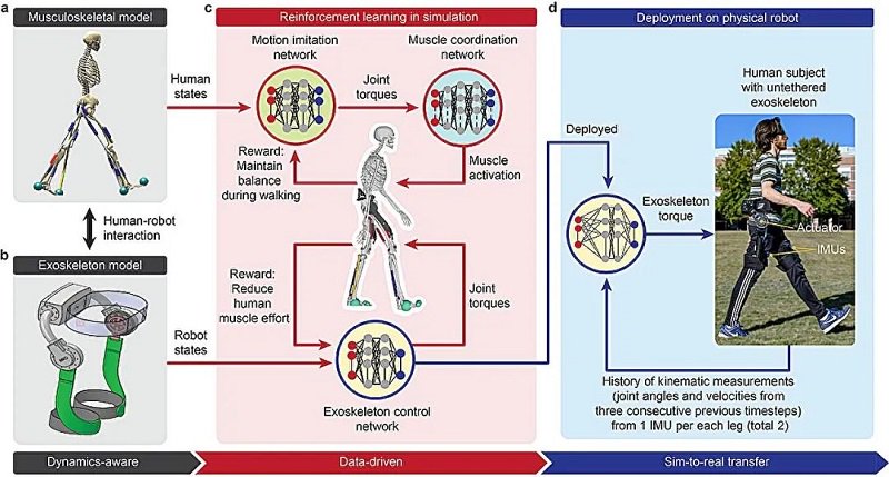 为克服这些困难,北卡罗来纳州立大学苏浩团队开发了一个能从人类与装置交互中学习的框架。该框架不需要漫长的人体实验和人力资源,其能在模拟中生成人体运动、肌肉协调和外骨骼控制的三个互联神经网络。他们对模型开展了数百万次模拟试验验证其能从人体移动数据中的学习能力。