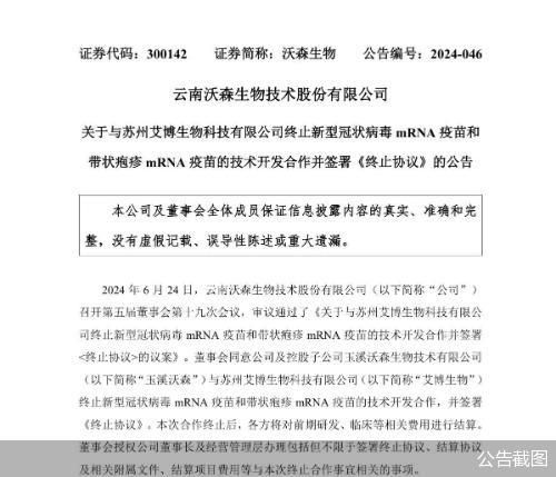 根据公告,沃森生物及控股子公司玉溪沃森决定终止艾博生物合作研发的新冠mRNA疫苗临床试验。该疫苗于2020年6月获国家药监局临床试验批件,已完成Ⅰ期、Ⅱ期及Ⅲ期临床研究。沃森生物同时终止的还有与艾博生物带状疱疹mRNA疫苗的技术开发合作。