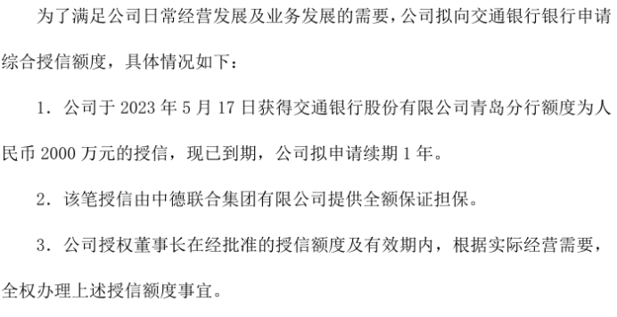 挖贝网6月18日,城市大脑 近日发布公告,为了满足公司日常经营发展及业务发展的需要,公司拟向交通银行银行申请综合授信额度,具体情况如下:公司于2023年5月17日获得交通银行股份有限公司青岛分行额度为人民币2000万元的授信,现已到期,公司拟申请续期1年。该笔授信由中德联合集团有限公司提供全额保证担保。公司授权董事长在经批准的授信额度及有效期内,根据实际经营需要,全权办理上述授信额度事宜。