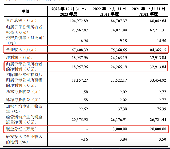 近年来,键邦股份业绩逐年下滑。招股书显示,2021年至2023年,该公司实现的营业收入分别为10.44亿元、7.54亿元和6.74亿元;实现的归母净利润分别为3.29亿元、2.43亿元和1.9亿元。