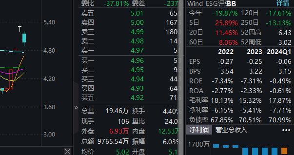业绩方面,公司2023年度归属于上市公司股东的净利润亏损10995.42万元,2024年一季度公归属于上市公司股东的净利润亏损2796.95万元,公司处于亏损状态。