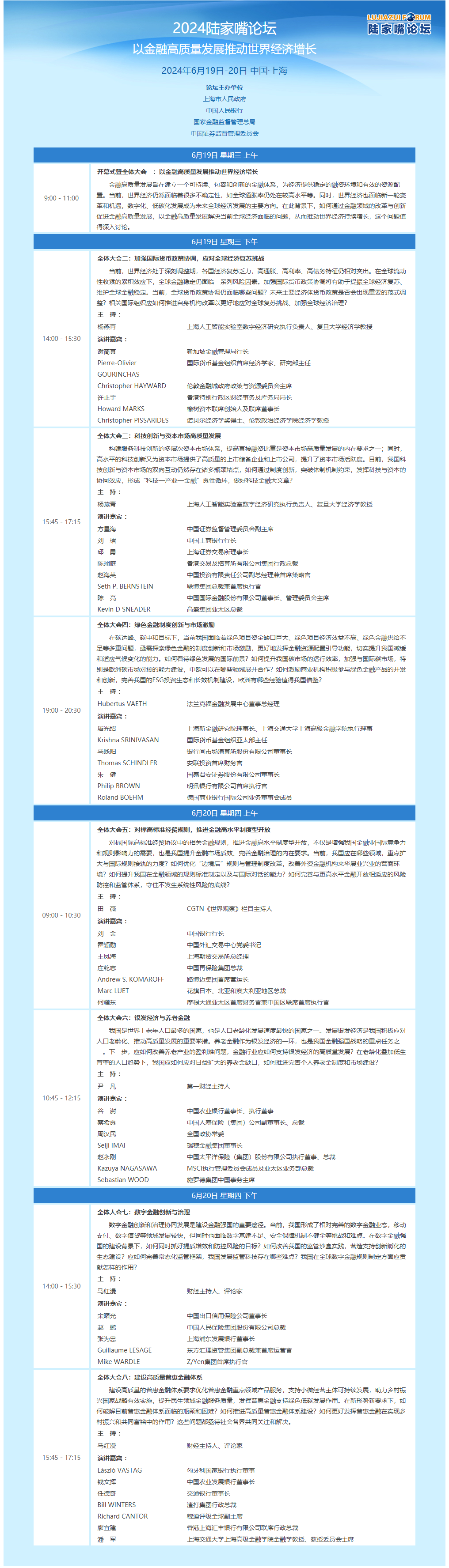 今年陆家嘴论坛设有8场全体大会,议题涵盖当前经济、金融领域的热点问题,分别聚焦“以金融高质量发展推动世界经济增长”“加强国际货币政策协调,应对全球经济复苏挑战”“科技创新与资本市场高质量发展”“绿色金融制度创新与市场激励”“对标高标准经贸规则,推进金融高水平制度型开放”“银发经济与养老金融”和“数字金融创新与治理”“建设高质量普惠金融体系”8个议题。