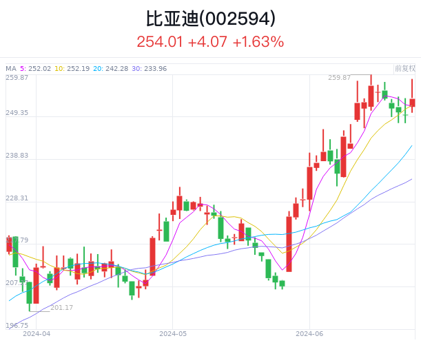 6月25日当天,比亚迪A股涨1.63%,报收254.01元/股;港股涨0.84%,报收239.60港元/股。