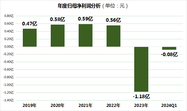 进入2024年一季度,亏损情况并未得到改善,亏损额约为-0.08亿元,同时营收也出现了32%的下滑,至1.63亿元。