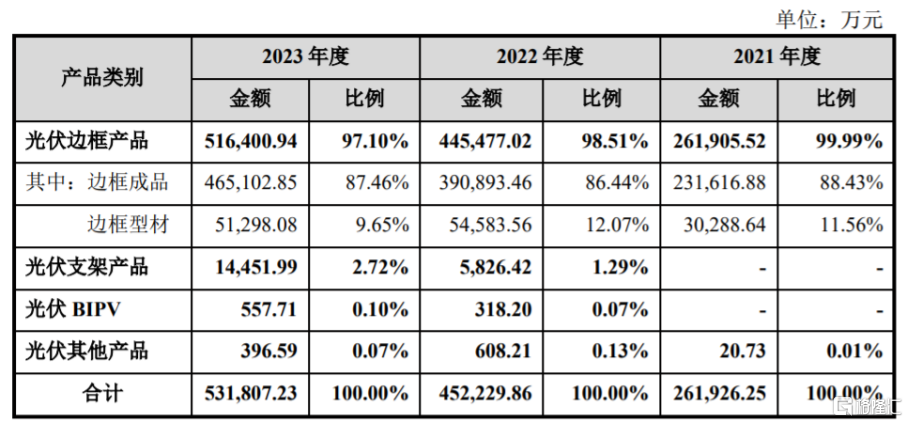 永臻股份主要从事绿色能源结构材料的研发、生产、销售及应用,主营产品包括光伏边框产品、光伏建筑一体化产品(BIPV)、光伏支架结构件。2021年至2023年,永臻科技超过97%的收入来自光伏边框产品。