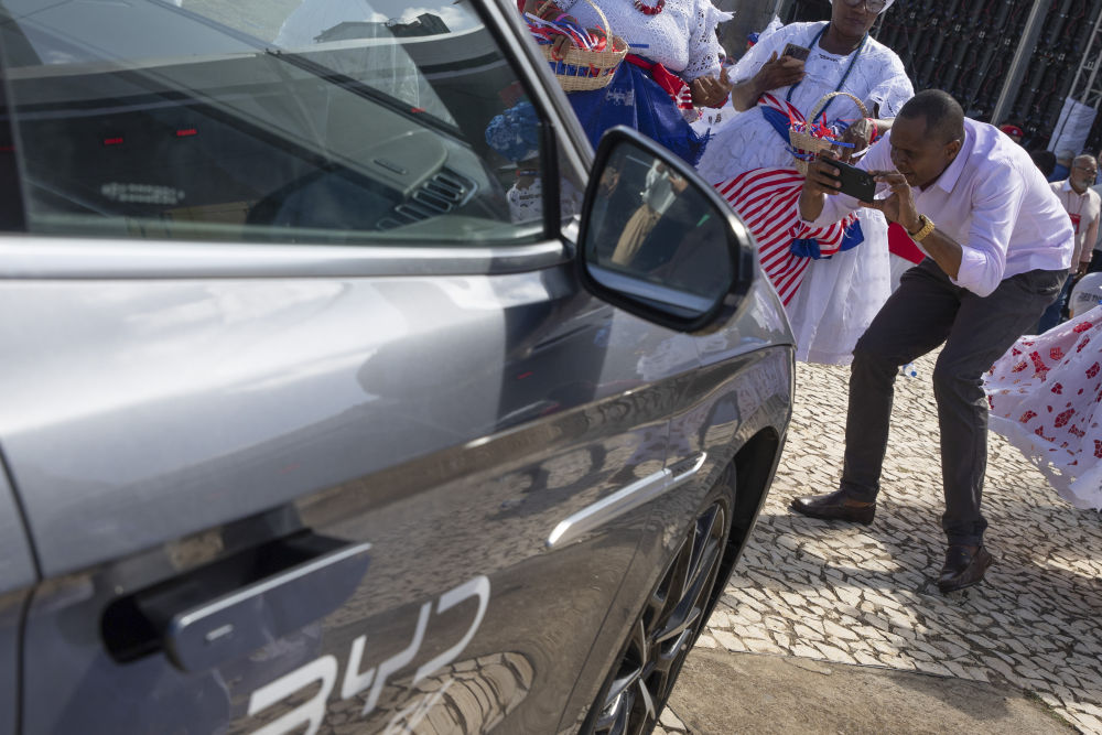 2023年7月4日,一名参观者(右)在巴西巴伊亚州首府萨尔瓦多拍摄一款比亚迪纯电动汽车。新华社记者王天聪摄