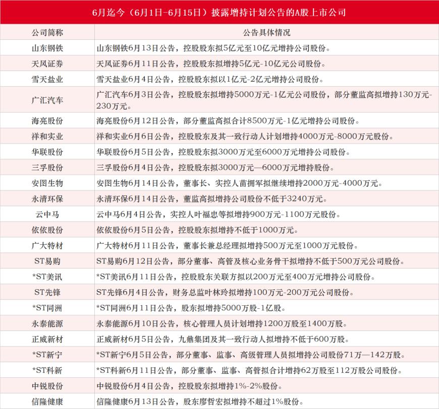 据财联社不完全统计,6月迄今包括山东钢铁、天风证券、雪天盐业、广汇汽车、海亮股份、祥和实业、华联股份、三孚股份、安图生物、永清环保、云中马、依依股份、ST易购、*ST美讯、ST先锋、*ST同洲、永泰能源、正威新材、*ST新宁、*ST科新、中锐股份、信隆健康在内的23家A股上市公司披露增持计划公告,详情见下图: