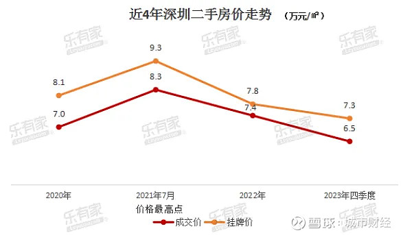 乐有家数据显示,2023年年末深圳的二手房均价跌至6.5万元/平方米,比2021年历史最高点8.3万元/㎡跌幅22%,比2022年跌12%。
