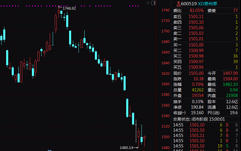 6月19日,贵州茅台(600519)终于迎来好消息,在除权(息)日当天,该股股价略有上涨0.7%,报收于1501元/股守住了1499元的象征性点位。