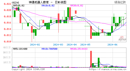 2024年06月17日早盘10时32分,神通机器人教育(08206.hk)股票出现异动,股价急速上涨5.56%。截至发稿,该股报0.019港元/股,成交量3000股,换手率0.00%,振幅0.00%。