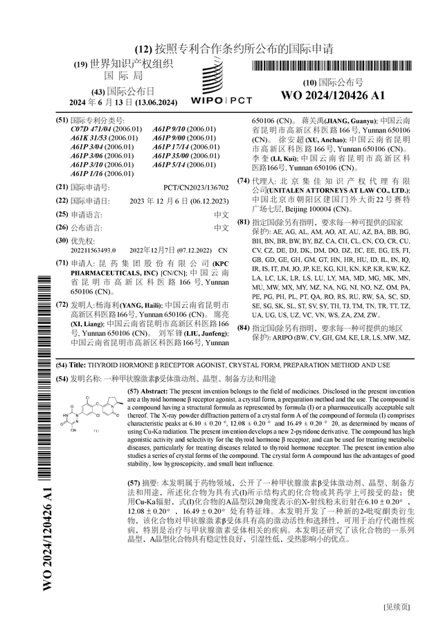 昆药集团公布国际专利申请:“一种甲状腺激素β受体激动剂、晶型、制备方法和用途”