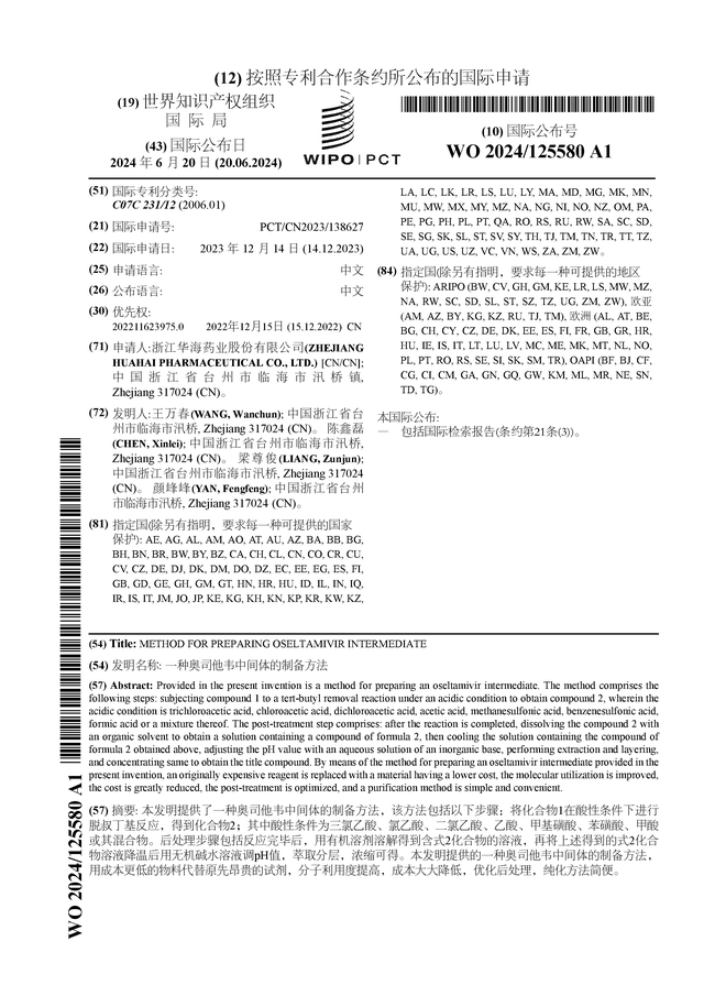 华海药业公布国际专利申请:“一种奥司他韦中间体的制备方法”
