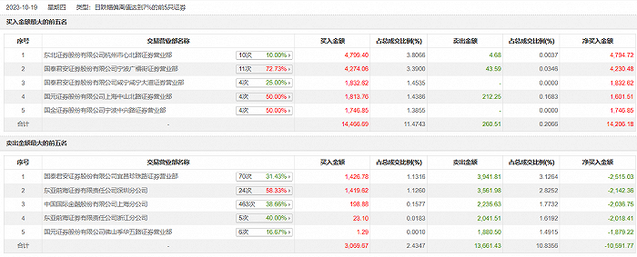 双鹭药业10月19日跌停,全天换手率达10.39%,振幅达6.54%。龙虎榜数据显示,营业部席位合计净买入3614.41万元。其中,国泰君安证券宜昌珍珠路证券营业部、东亚前海证券深圳分公司分别卖出3941.81万元、3561.98万元;东北证券杭州市心北路证券营业部、国泰君安证券宁波广福街证券营业部分别买入4799.40万元、4274.06万元。