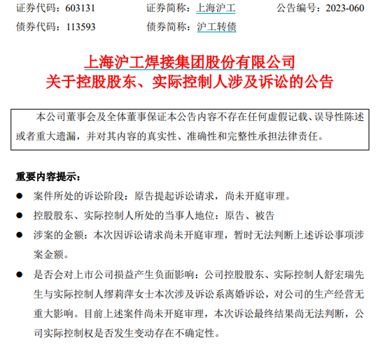 10月18日晚,上海沪工公告称,公司实控人舒宏瑞因个人原因向上海市徐汇区人民法院提起诉讼请求,要求判令其与实控人缪莉萍解除婚姻关系,并进行财产分割。