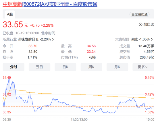 截至最新收盘,中炬高新股价上涨2.29%报收33.55元/股。