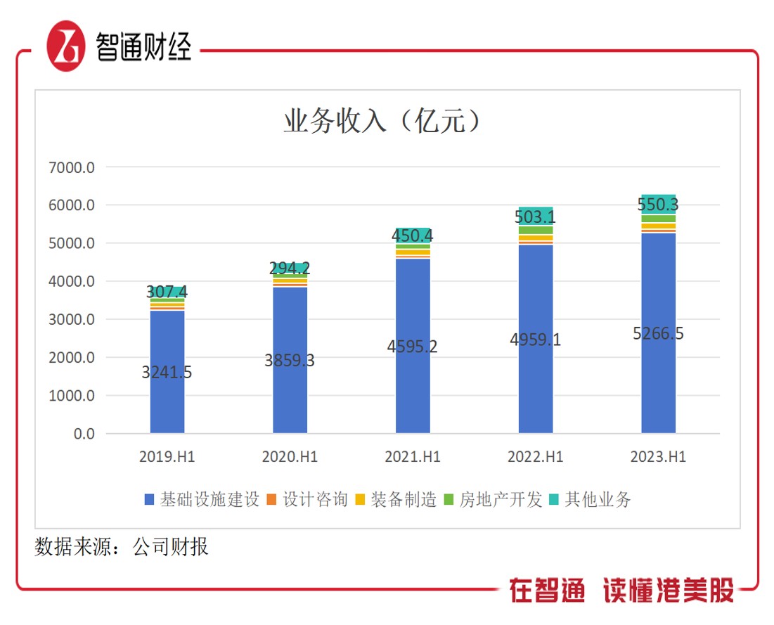 基础设施建设是核心业务,收入份额常年均超过80%,2023年上半年,基础设施建设收入为5266.5亿元,收入份额83.6%,新签合同金额9291.7亿元,占比总合同金额72.9%。此外,期间设计咨询、装备制造、房地产开发及其他业务收入份额分别为1.53%、2.78%、3.36%及8.73%。