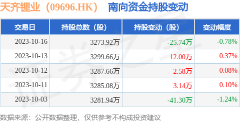 天齐锂业(09696.HK):10月16日南向资金减持25.74万股