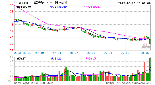 10月16日,交易行情显示,海天味业低开0.05%,开盘价为38.9元/股,开盘后,公司股价迅速下挫,最终收盘价为35.85元/股,收跌7.89%,总市值为1993亿元,跌至2000亿元以下。