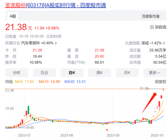 在诸多“龙”股中,圣龙股份最为引人关注。公司股票自9月27日至10月16日8个交易日中,7个交易日收盘价格涨停,自9月27日以来,圣龙股份收盘价累计上涨幅度为78.91%,同期申万汽车零部件行业平均涨幅为4.41%,公司股票短期涨幅严重高于同期行业涨幅及上证指数,存在市场情绪过热的情形。