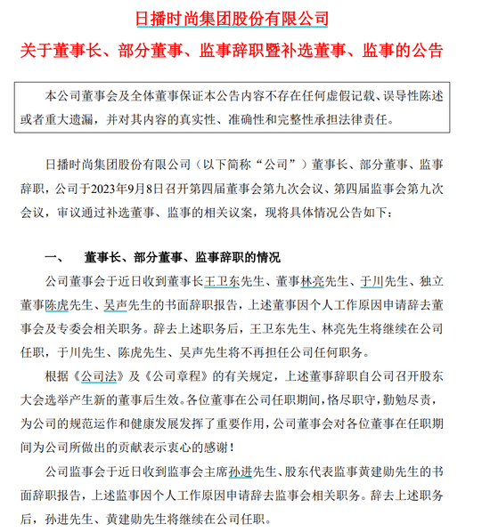 9月9日,日播时尚发布公告称,公司董事长王卫东等7位公司高层集体提出辞职。公告显示,除了公司董事长,请辞的还有董事、独立董事、监事会主席和股东代表监事。公告显示,辞去上述职务后,仍有4位高层继续在公司任职,其中包括公司原董事长王卫东和原董事林亮。