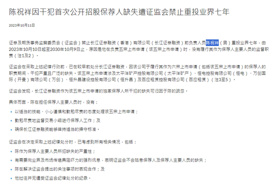 继长江证券融资收到两千万罚款和暂时吊销执照之后,时任负责人也被到香港证监会”追罚“,禁止重投业界七年。