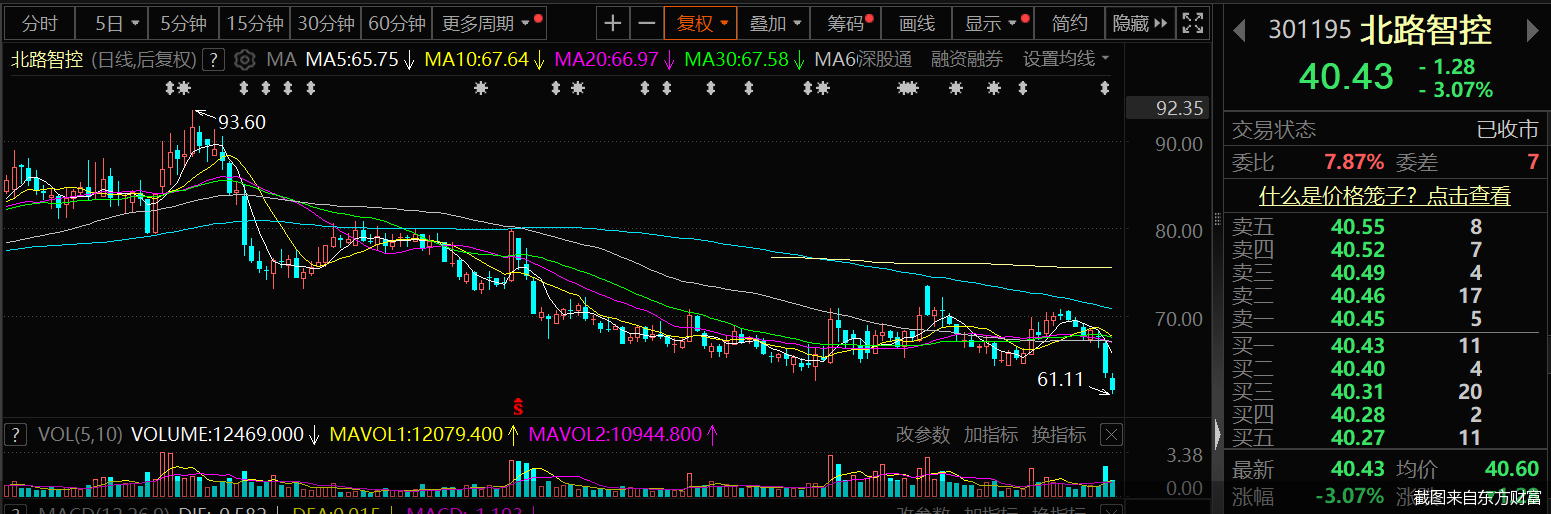 交易行情显示,10月20日,北路智控股价低开1.01%,开盘后公司股价处于低位震荡态势,盘中触及40.14元/股的低点。以后复权形式来看,北路智控40.14元/股的价格也创下了上市后新低。截至当日收盘,公司股价报40.43元/股,收跌3.07%,总市值为53.17亿元。