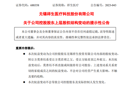 截至目前,祥生投资持有祥生医疗4536万股股票,占上市公司总股本的40.46%,系上市公司控股股东。估算下来,莫善珏分别向莫善珏、陆星羽转让了间接市值2.31亿元、1647.48万元的股权。上市公司公告并未披露两笔股权交易的价格。