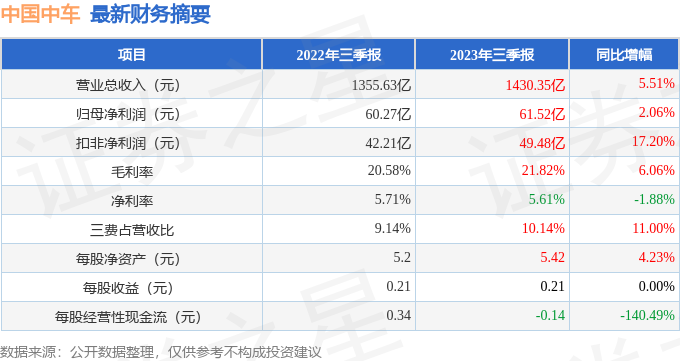 据证券之星公开数据整理,近期中国中车(601766)发布2023年三季报。根据财报显示,本报告期中中国中车营收净利润同比双双增长。截至本报告期末,公司营业总收入1430.35亿元,同比上升5.51%,归母净利润61.52亿元,同比上升2.06%。按单季度数据看,第三季度营业总收入557.32亿元,同比上升2.7%,第三季度归母净利润26.91亿元,同比下降7.09%。