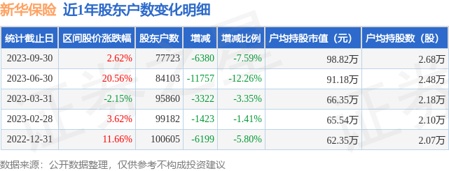 从股价来看,2023年6月30日至2023年9月30日,新华保险区间涨幅为2.62%,在此期间股东户数减少6380.0户,减幅为7.59%。