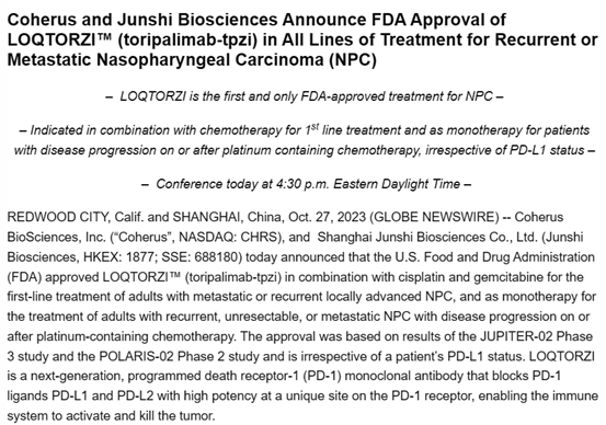 上证报中国证券网讯(霍星羽 记者 刘雪)美国生物制药公司Coherus BioSciences官网显示,当地时间10月27日,该公司与君实生物共同宣布美国食品药品监督管理局(FDA)批准LOQTORZI™用于治疗复发性或转移性鼻咽癌(NPC)。据悉,该药物是FDA批准的美国第一个用于鼻咽癌患者的药物。
