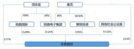 其控股股东是丽晶电子集团,项乐宏及其配偶姜艺为实际控制人,截至目前,通过控制的相关公司合计持有乐歌股份48.49%的股权。