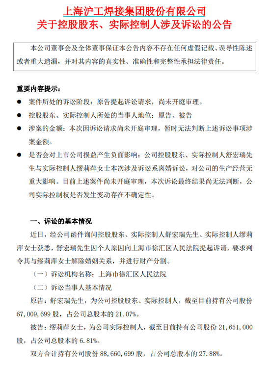 上海沪工:实控人舒宏瑞向法院要求判令其与缪莉萍解除婚姻关系